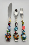 This pattern of servers come with a true cheese knife. Its great for slicing cheese or using for butter. This are all stainless steel wrapped with glass and genuine stone beads.